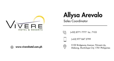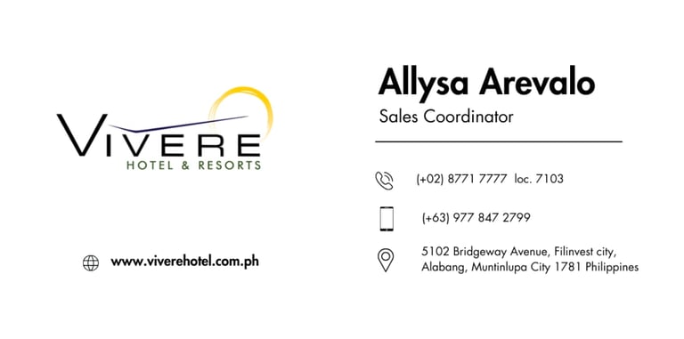 For family and friends who may also wish to experience Vivere Hotel’s charm, we’ve included their calling card. When booking, kindly mention that it is under Jenina Coloyan’s wedding to enjoy special wedding discounts.